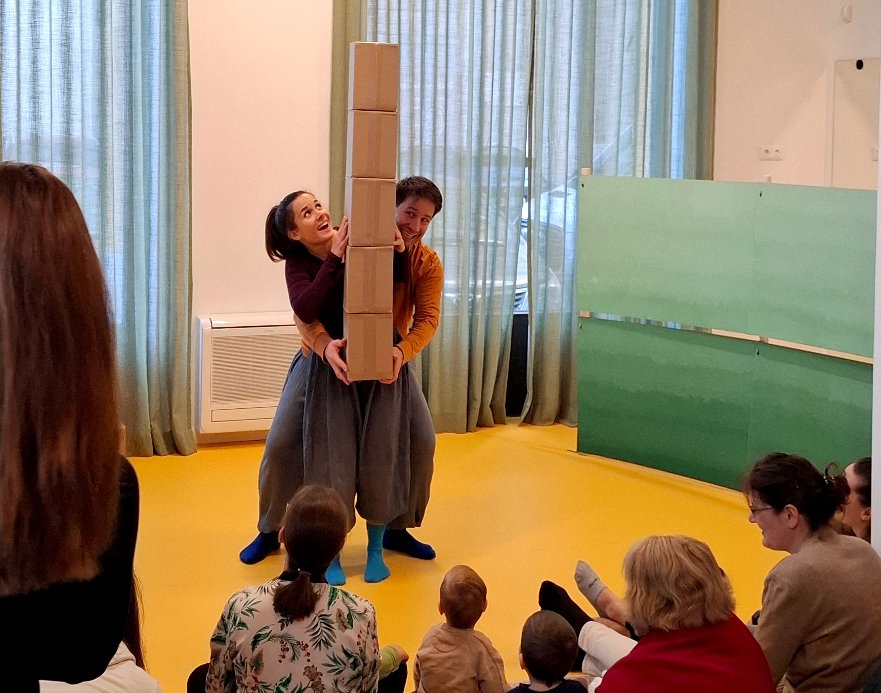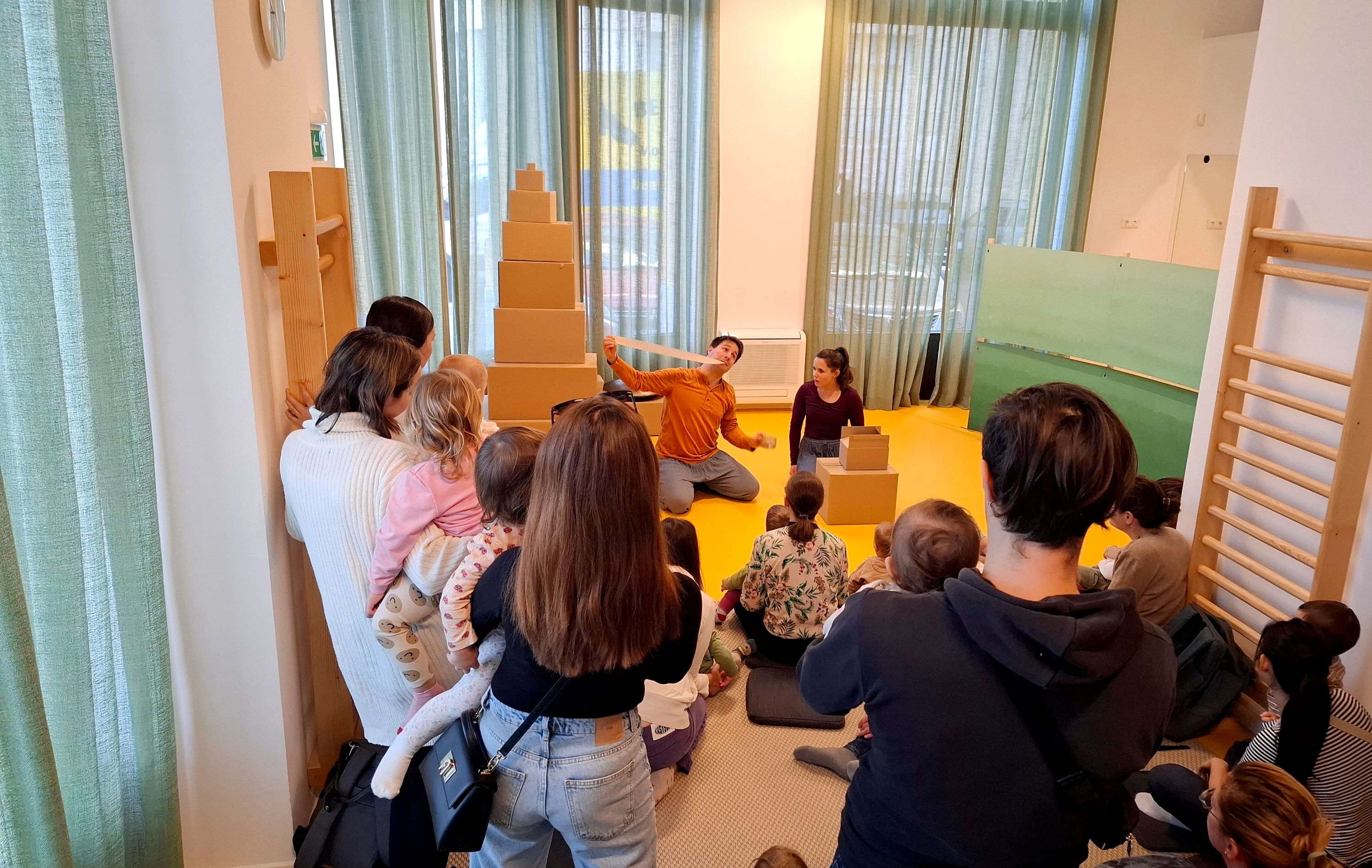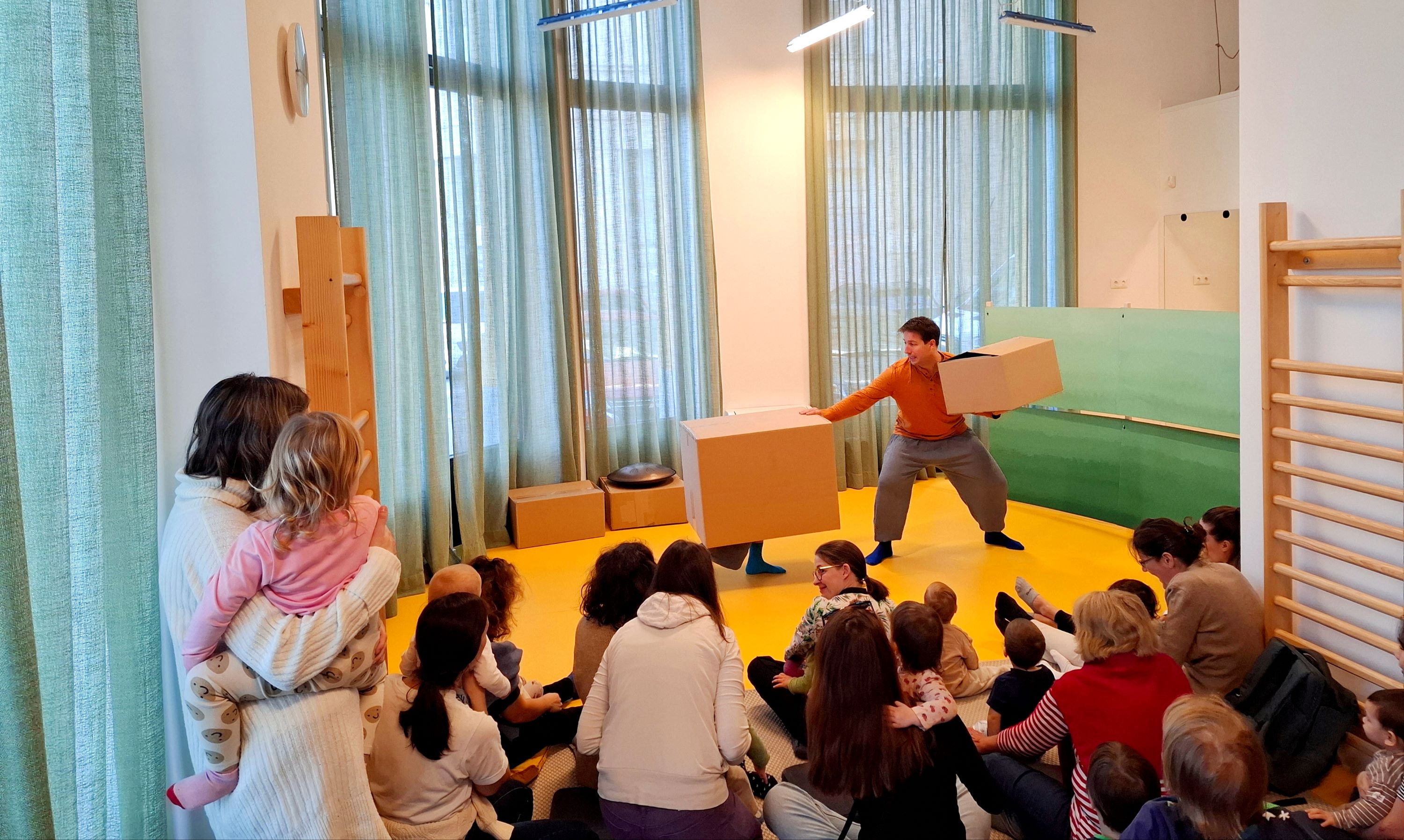 „Hűha! Egy hatalmas doboz! Arrébb tudom tolni? Mi lehet benne? Bele kellene nézni! De jó hangja van! És milyen az íze? Hol lehet kinyitni? Beleférek? Hú, ez tele van!” Mennyire izgalmas egy papírdoboz? És kettő? Vagy netán öt? És ha nincs más a játéktérben, csak dobozok? Az egyik apró és zörög, a másik színes és nehéz, a harmadik óriási és beleférünk. Játék kartondobozokkal és papírokkal.